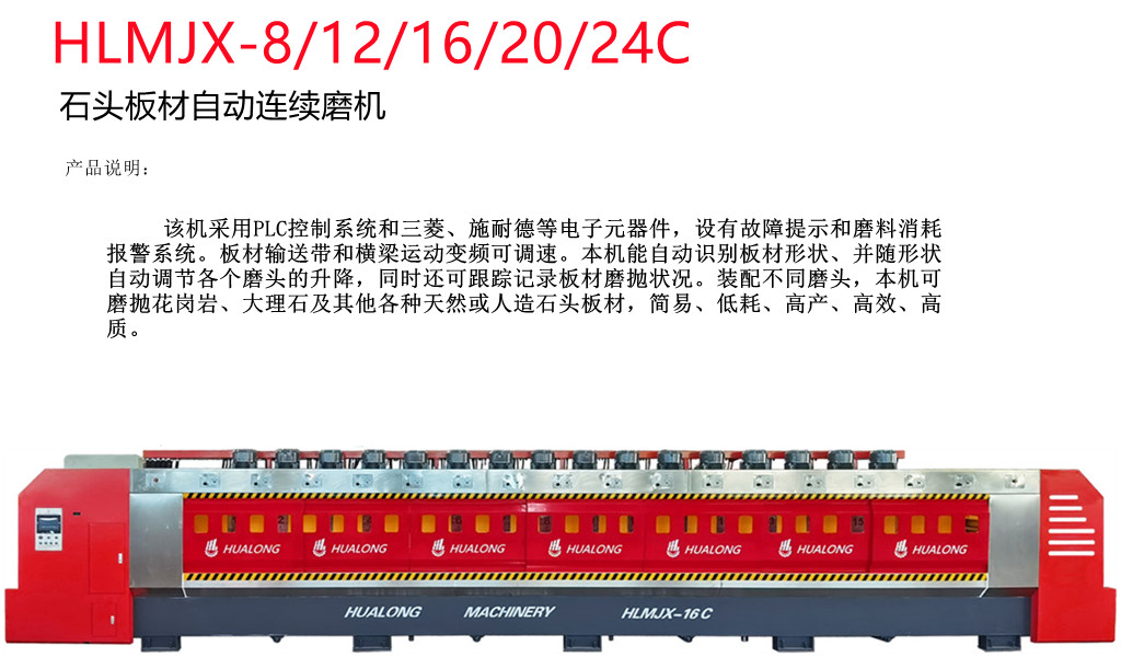HLMJX-16 型主动石材板材持续抛光机,装备多个树脂盘头和 PLC 节制体系,可以或许持续主动地对板材停止研磨和抛光,是花岗岩等硬质石材外表处置的抱负挑选。装置差别范例的头,它也很是合适大理石、石英岩和其余石材板材的加工。