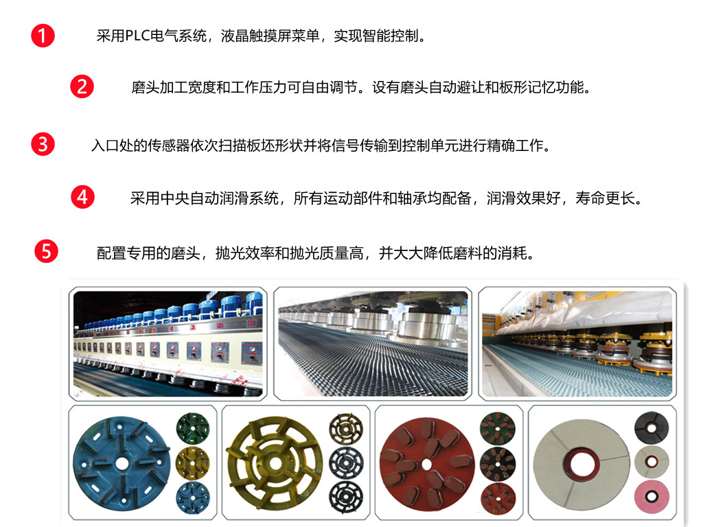 Main FeaturesHLMJX-16,equipped with multiple resin disc heads and PLC control system, can grind and plolish slabs continously and automatically, is perfect for surface finishing of hard stone such as granite. Mounted with different type of heads, it’s also great for marble, quartize and other stone slab finishing.1) Using PLC electrical system and LCD screen menu offer intelligent control. 2) Processing width and working pressure of grinding heads can be adjusted freely . 3) Sensor at the entrance to scan the shape of the slabs in sequence and transmit the signal to controlling unit for precise working 4) Adopting central automatic lubrication system, having all moving parts and bearings to get a good lubricating effect and longer life. 5) Conveyor self-cleaning and stone chip removing system